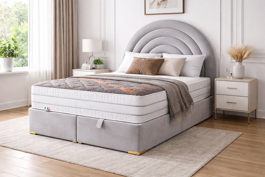 Avec sa tête de lit capitonnée et ses touches dorées, ce sommier apporte une ambiance luxueuse et moderne à votre intérieur.